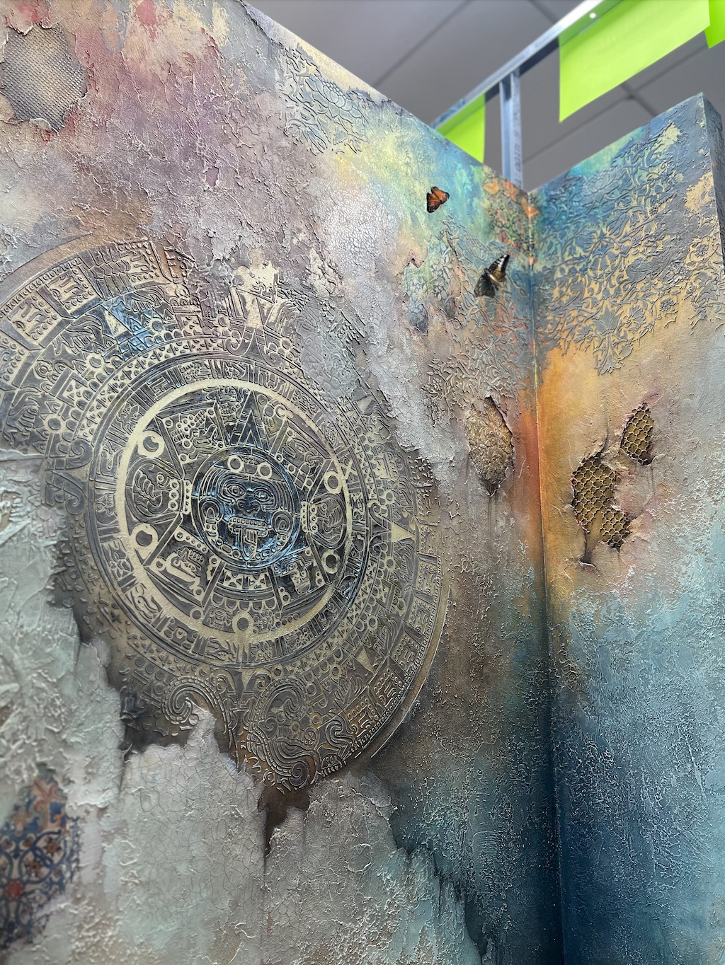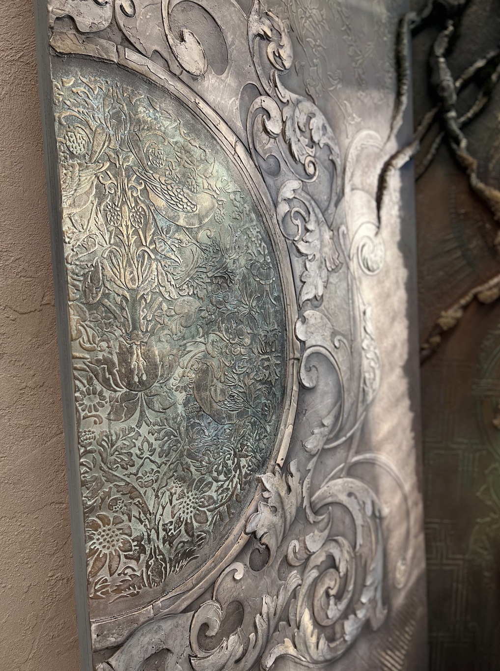 Так же хотим показать наш красивый стенд, который помимо образцов состоял из 4х панелей 95х245см в разных стилизациях от темного к светлому монохрому так же с этническими и классическими нотками в современном подходе по декоративным покрытиям, где мы применили наши уникальные многослойные трафареты и добавили барельеф, мох-ягель, трансферы, аэрографию, декоративные накладки и интерьерные часы так же нашего производства.