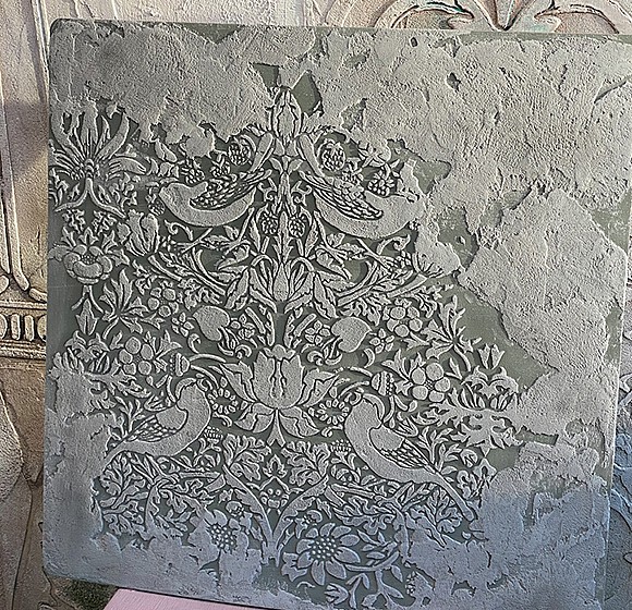 Не снимая трафарет наносим на объёмную гладкую штукатурку перламутровую цветную, снимаем трафарет. Сушим.