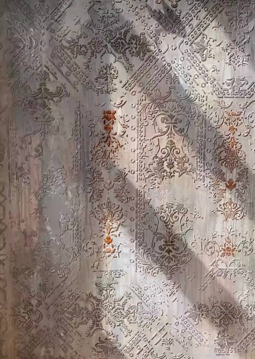 Трафарет для имитации большого ковра или объёмного орнамента, созданный из наших трафаретов: Авиньон, Самира, Виола, Далида и Эльза в бесконечном раппорте.